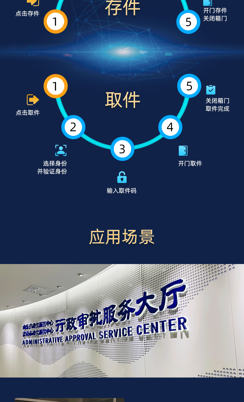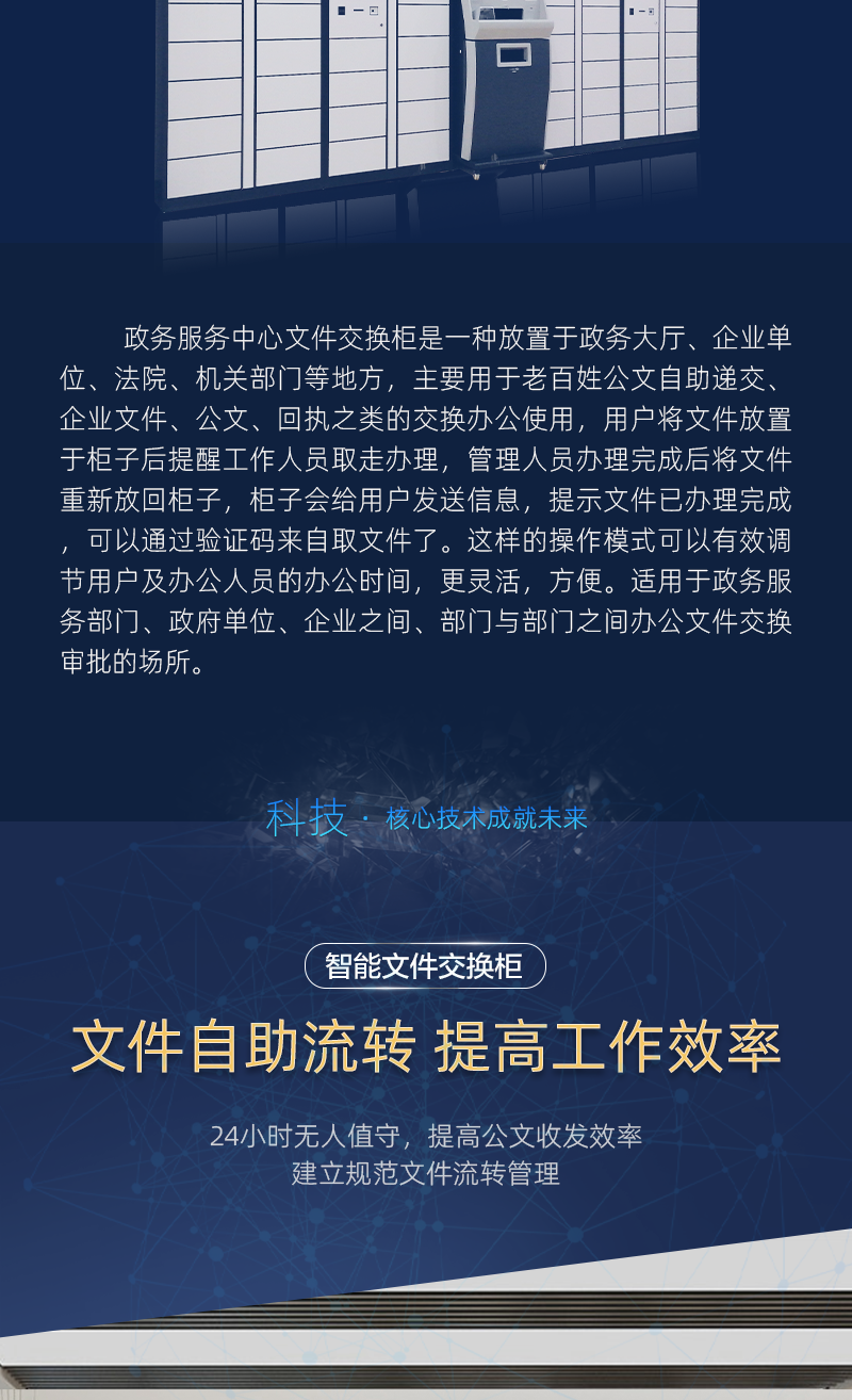 24小時(shí)自助存取件柜24小時(shí)自助存取件柜是一種放置于政務(wù)大廳、企業(yè)單位、法院、機(jī)關(guān)部門等地方,主要用于老百姓公文自助遞交、企業(yè)文件、公文、回執(zhí)之類的交換辦公使用,用戶將文件放置于柜子后提醒工作人員取走辦理,管理人員辦理完成后將文件重新放回柜子,柜子會(huì)